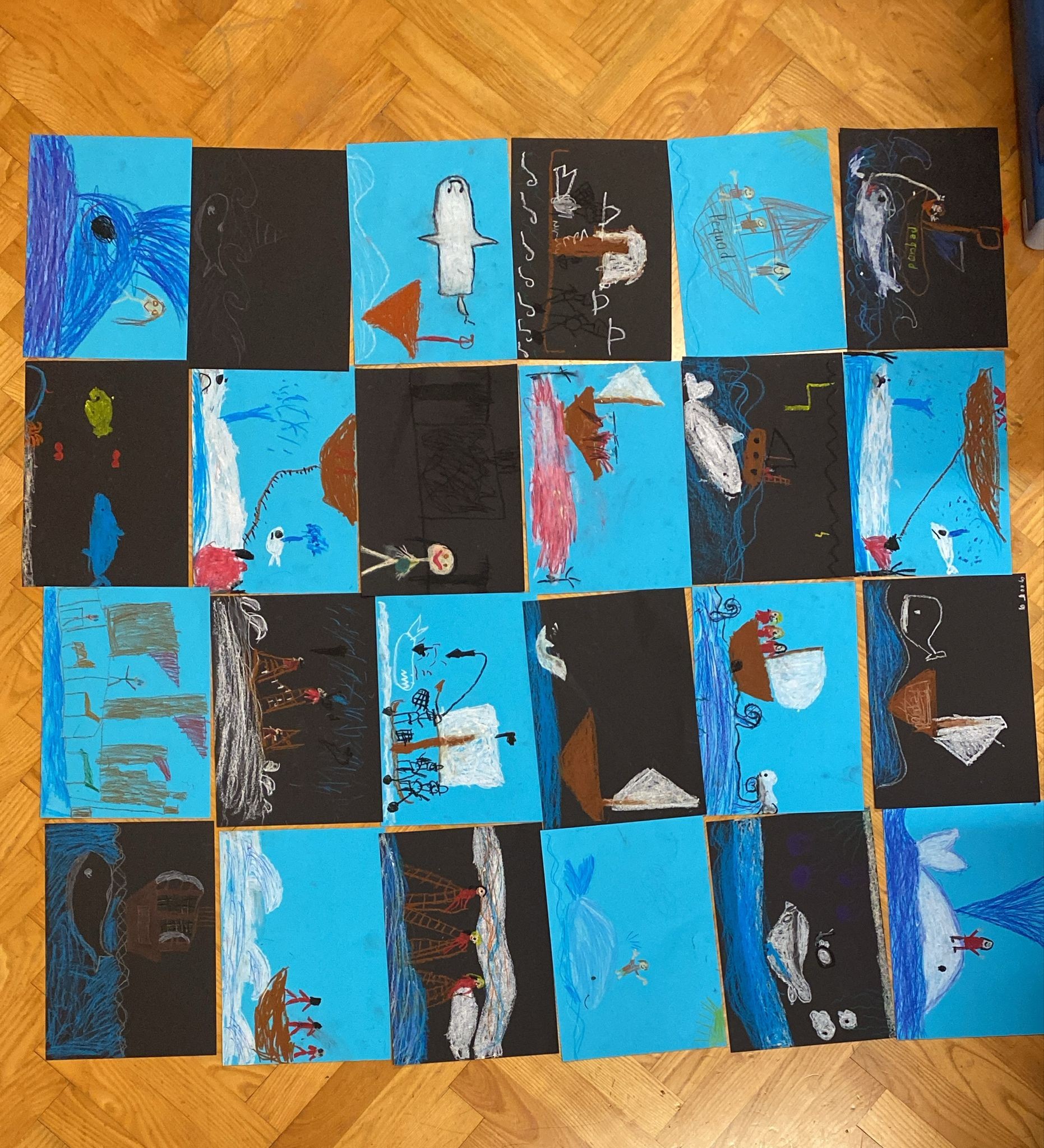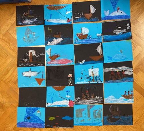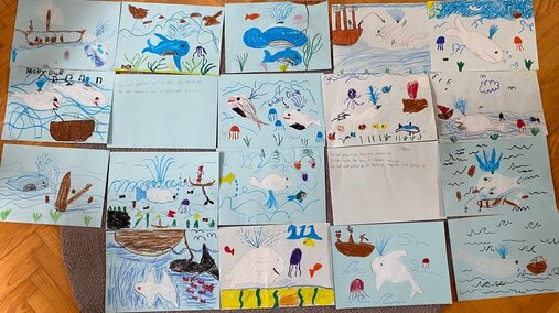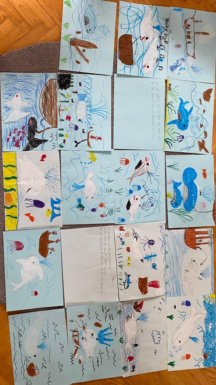 Diese Emotionen wurden im Unterricht sofort in Bildern festgehalten. Während die 2C die Szenen des Theaterstücks gemalt hat, hat die 2B die Geschichte des Wales zu Bild gebracht.